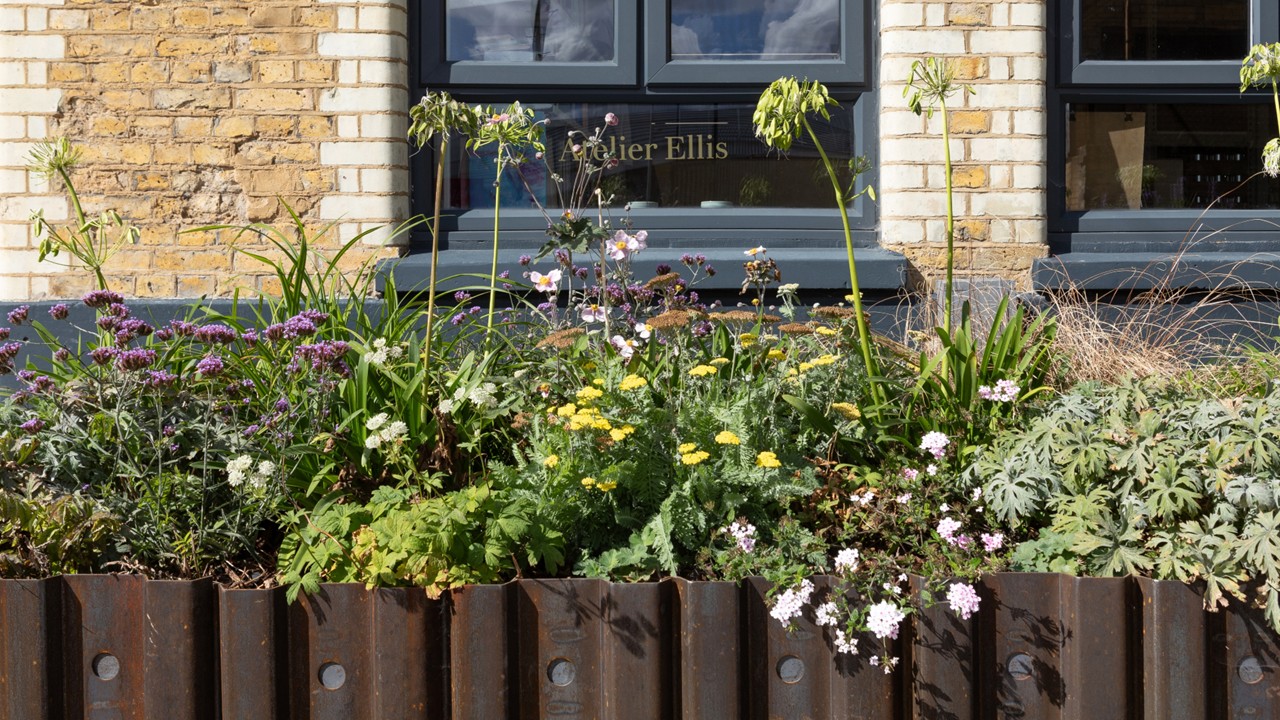 Alongside the mural, two Pryus trees and planting has been added in planters made from reclaimed sheet piling – a fitting tribute to The Bottle Factory and Old Kent Road’s industrial past.